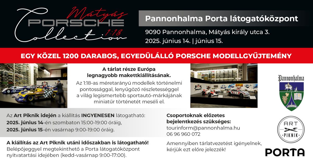 Am Samstag, den 6. September 2025, erwartet alle, die das Besucherzentrum Pannonhalma Porta besuchen, ein besonderes Erlebnis. Um 10:00 Uhr morgens kommen die beeindruckenden Porsche-Sportwagen, organisiert vom Porsche Sport Car Club Hungary, die Besucher können sie bis 14:30 Uhr bewundern. Am ganzen Tag ist außerdem die Mátyás Porsche 1:18 Collection Modellausstellung individuell besuchbar. Um 16:15 Uhr begrüßt der Eigentümer selbst, László Mátyás, die Besucher zu einer besonderen Führung, bei der er persönliche Geschichten und interessante Details zu einer der größten Porsche-Modellautosammlungen Ungarns erzählt. Ein einzigartiges Erlebnis für alle Auto-Fans! Eintrittspreise für die Mátyás Porsche 1:18 Collection Modellausstellung: